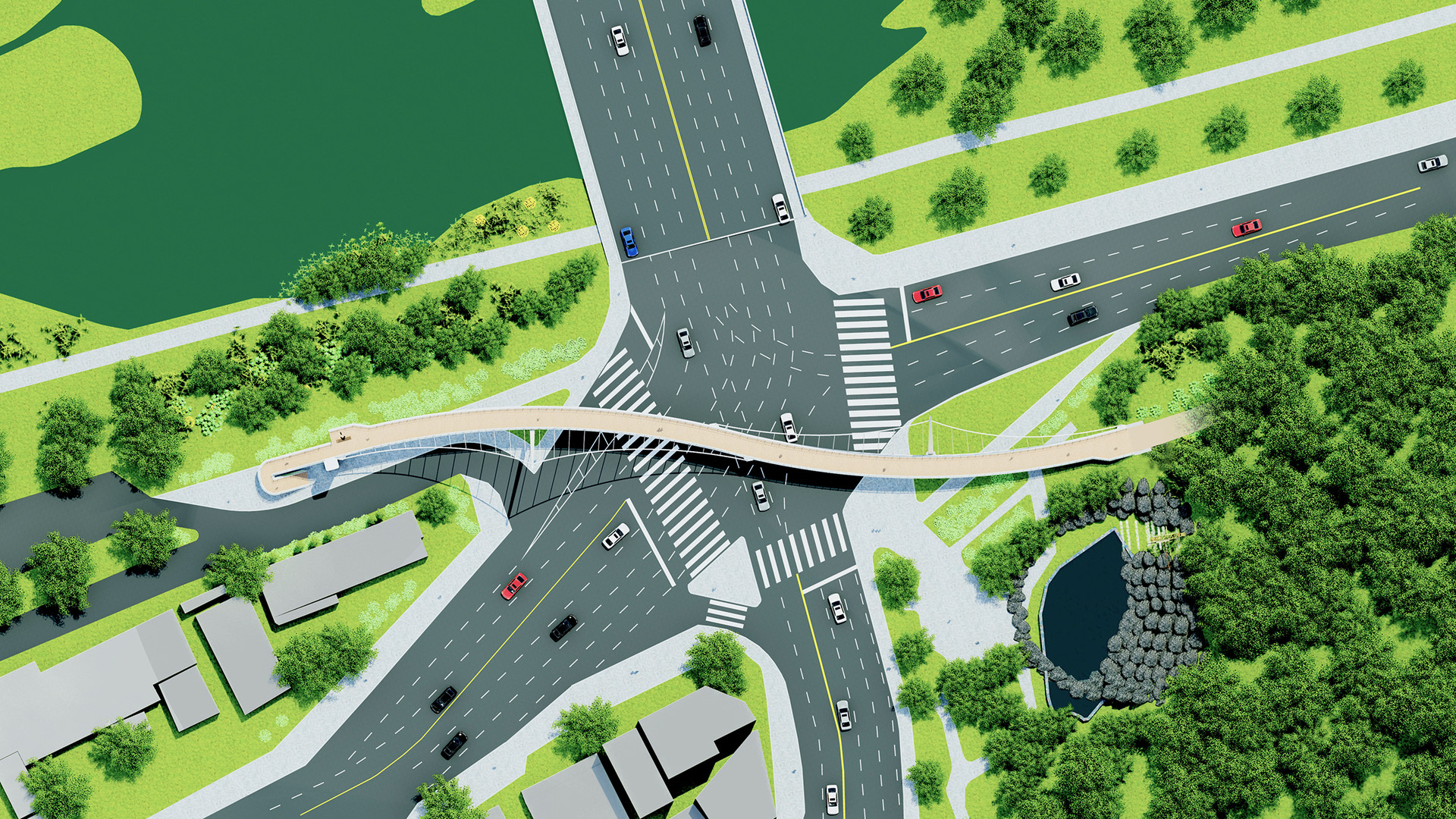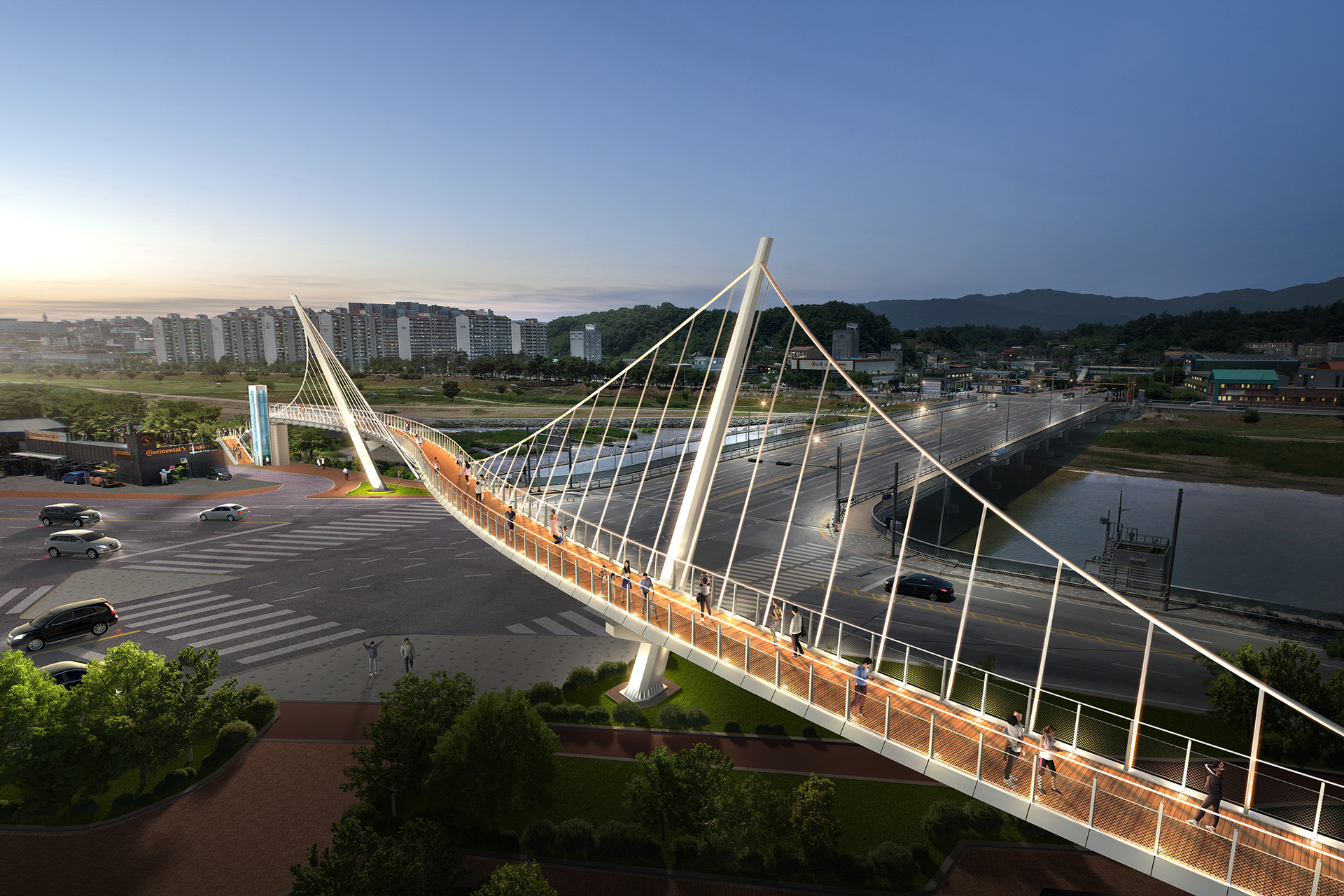 The pedestrian bridge crosses the wide Seocheon intersection diagonally in Yeongju, known as the hometown of Sunbi(scholars of the Chosun dynasty). It connects the Seocheon and Cheoltansan sections of the Yeongju City Circular Pedestrian Road Project.